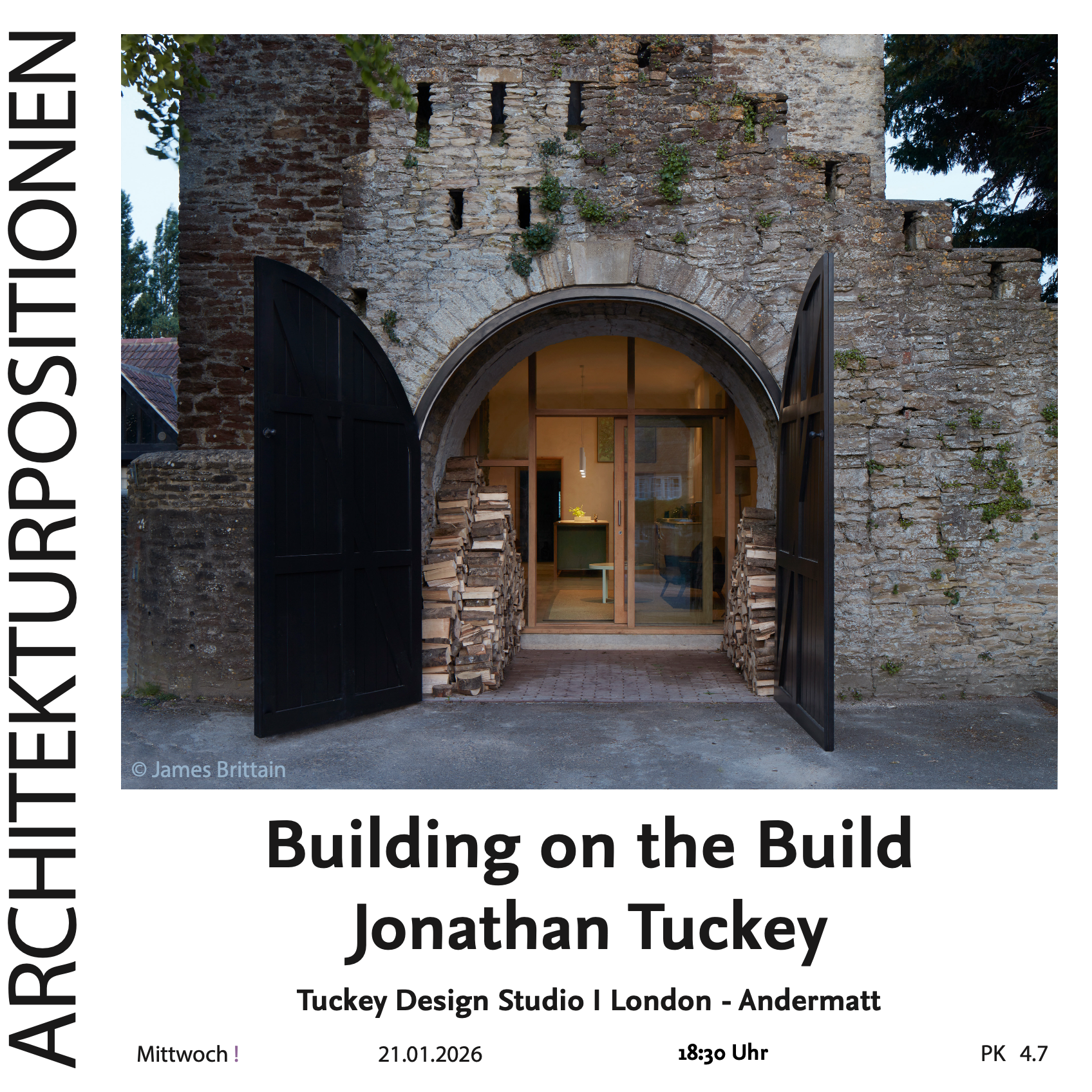 Tuckey Design Studio hat Bauten wie das wegweisende Rammed Earth House in Wiltshire, das Wohnprojekt King's Cross Gasbehälter in London, das Trevarefabrikken Hotel und Kulturzentrum auf den Lofoten (N), das mit dem RIBA Award 2023 ausgezeichneten Horris Hill School Theatre in Hampshire und das Wachthuus, ein Restaurant mit Skihütte in Andermatt realisiert. In seinem Vortrag wird Jonathan Tuckey Beispiele aus dem Portfolio des Studios vorstellen, die die heutige Herangehensweise des Büros an Sanierung und Wiederverwendung geprägt haben.