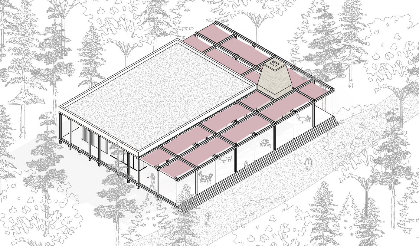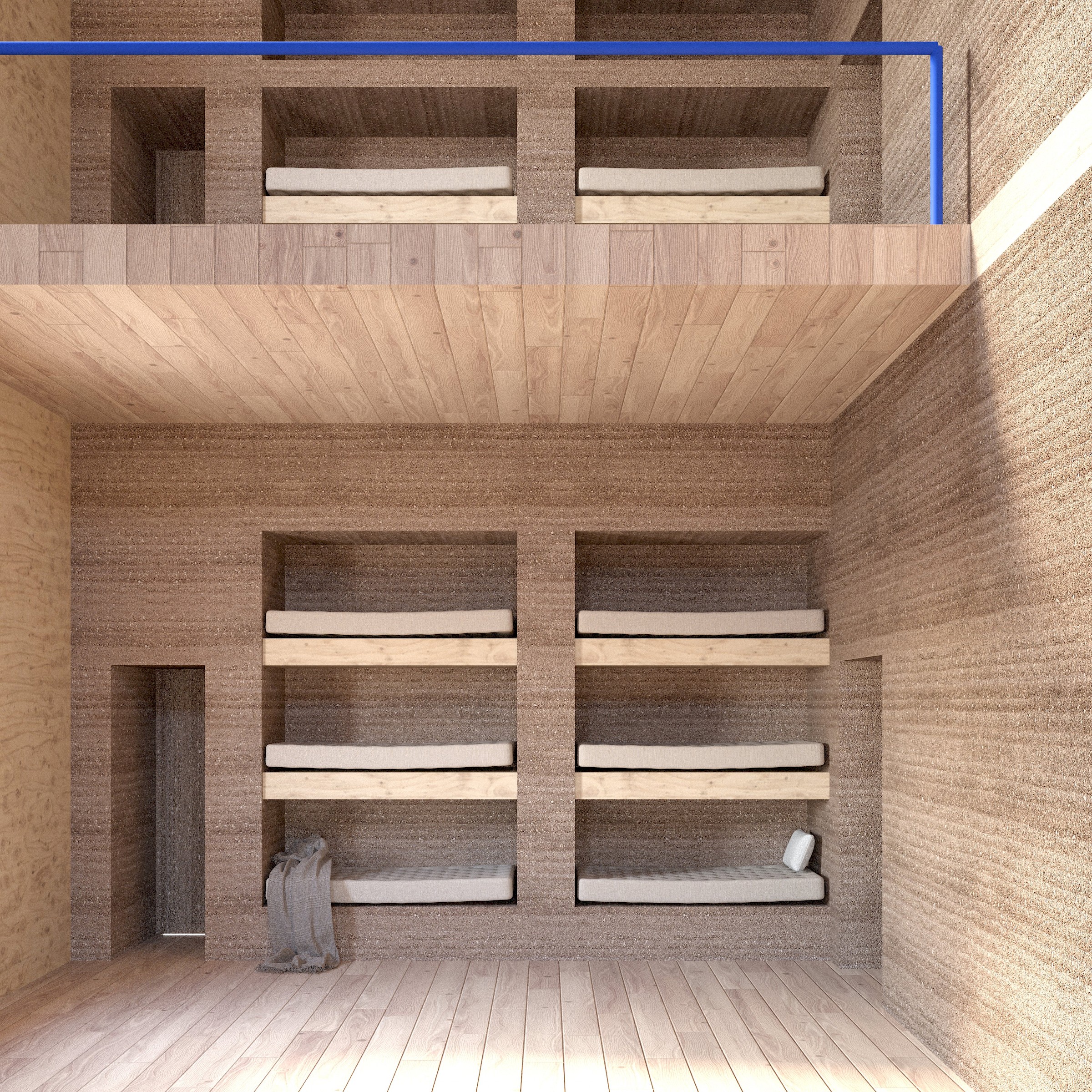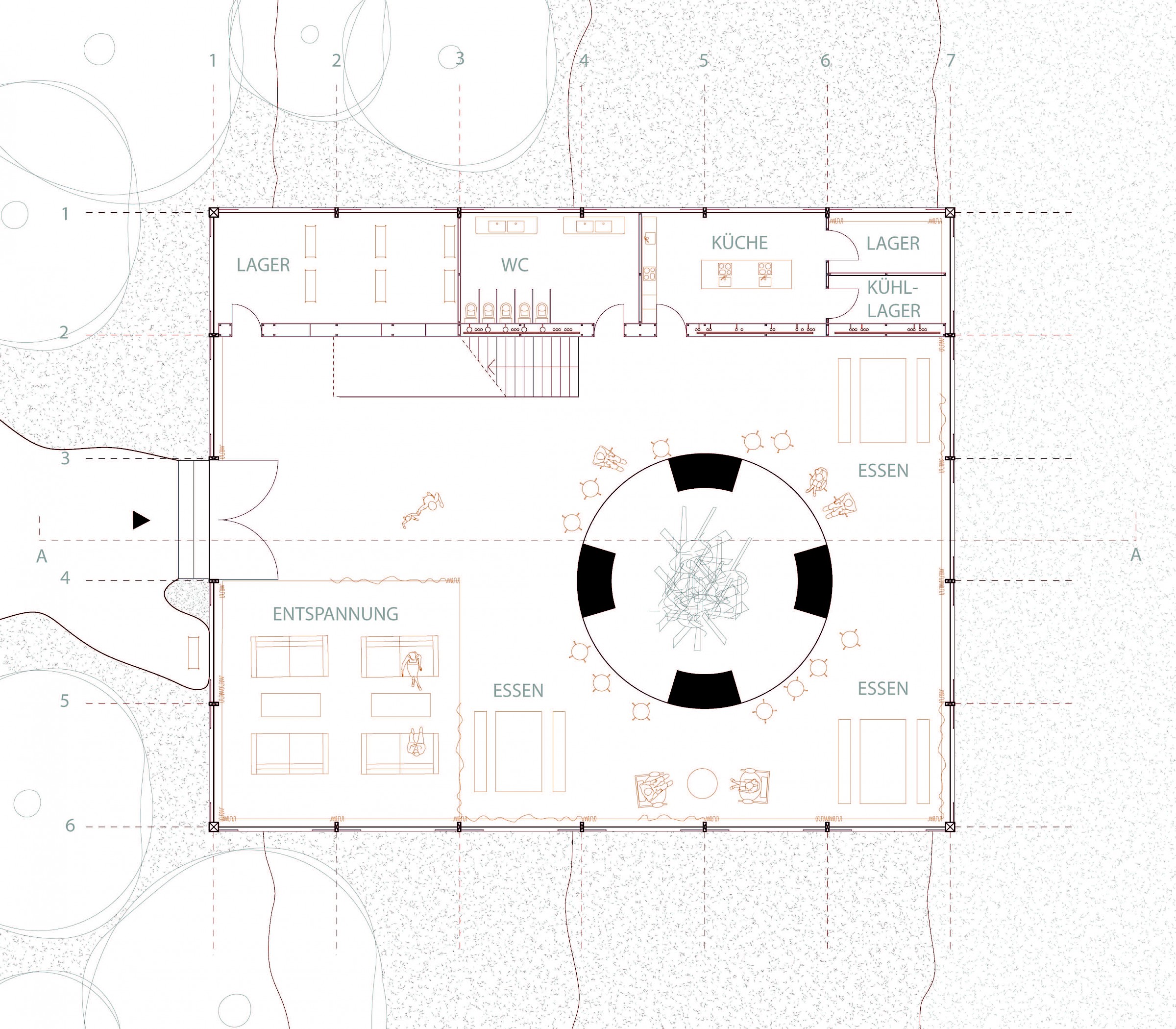 Das Raumprogramm integriert fünf verschiedene Nutzungen. Diese können sowohl als ein zusammenhängendes Gebäude, als Ensemble oder auch als einzelne Solitäre konzipiert werden. Dazu gehören Schlafmöglichkeiten, eine Urhütte als Kochstelle, ein Werkraum für kreative Betätigung, in dem Interessierte die Naturerfahrungen beim Wandern künstlerisch einfangen können, ein Café, sowie eine selbst zu formulierende Nutzung, die das individuelle Entwurfskonzept unterstreicht. Dies könnte beispielsweise ein Aussichtspunkt, eine Waldbühne, ein Andachtsraum oder eine Badestelle sein.