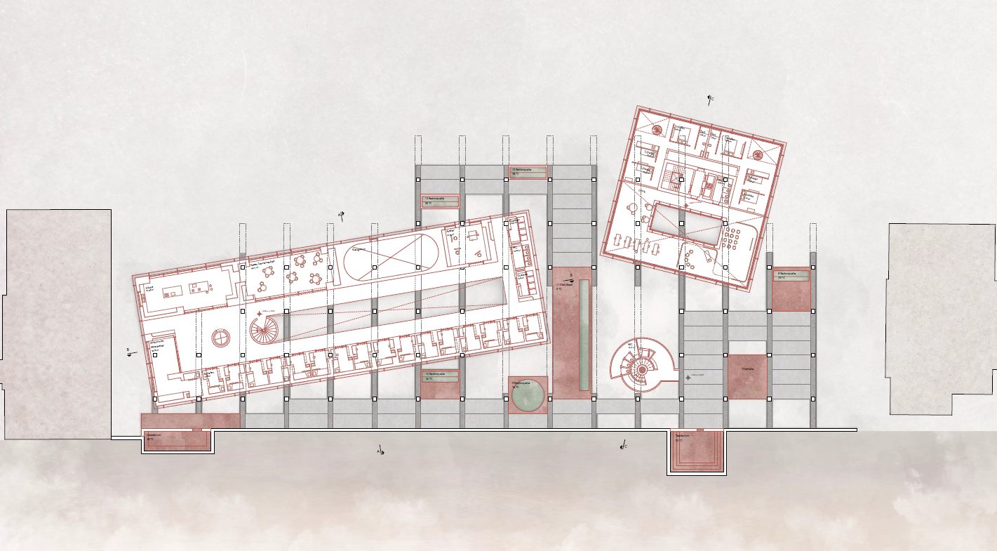 Um den inhaltlichen Schwerpunkt der „Atmosphärischen Möglichkeitsräume“ der letzten Semester weiterzuentwickeln, beschäftigt uns weiterhin die Frage, welche strukturell-räumlichen Elemente und Phänomene ein Gebäude befähigen, verschiedene Programme aufzunehmen – und dennoch seinen eigenständigen räumlichen Ausdruck und Charakter zu behaupten.