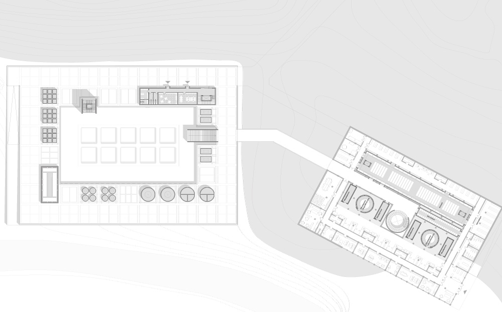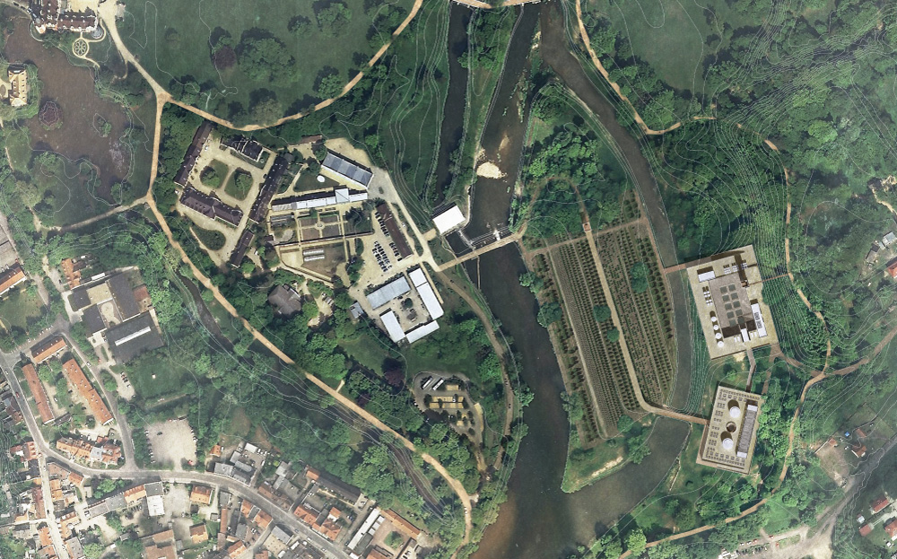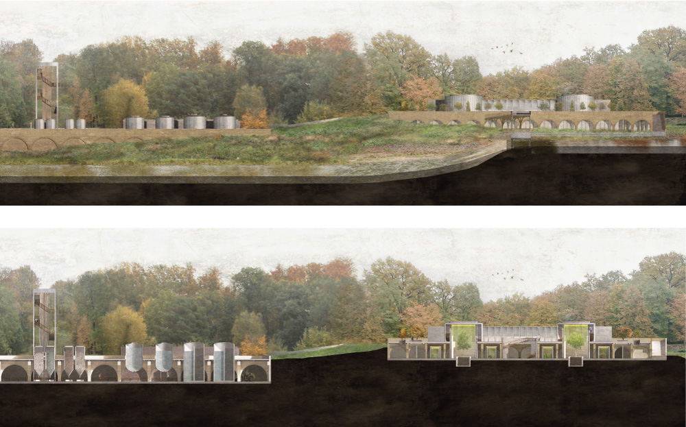 An der Stelle eines alten Wehrs entwerfen wir ein Ensemble aus Besucherhaus, Keramikhaus und Speisehaus, das seine Energie durch eine Wasserkraftanlage aus der Neiße bezieht. Es ist gleichermaßen landschaftlich wie urban präsent und verbindet überbrückend beide Seiten miteinander.